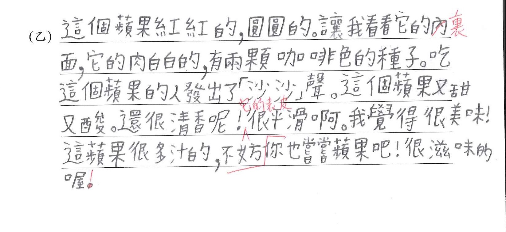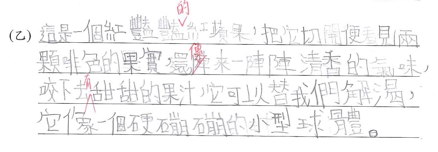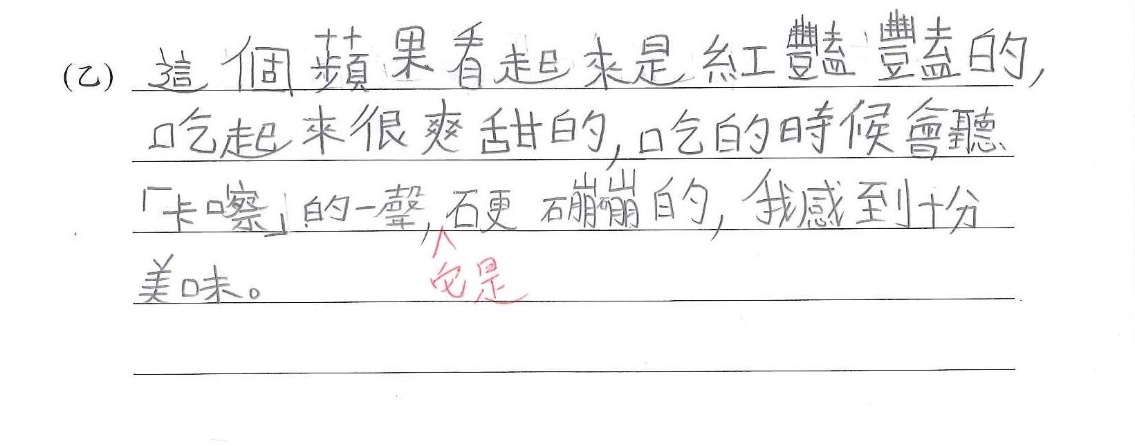 - 學生在尚未學習「多感官描寫」前嘗試為水果造句。 - 於完成課堂後以後測的形式評估學習成果