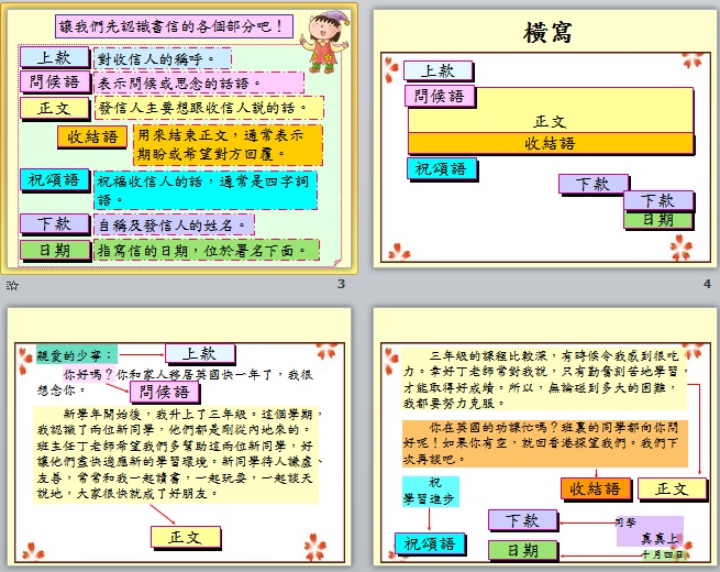 傳統面授教學: - 重溫書信的格式 - 能找出課文中書信的各種格式