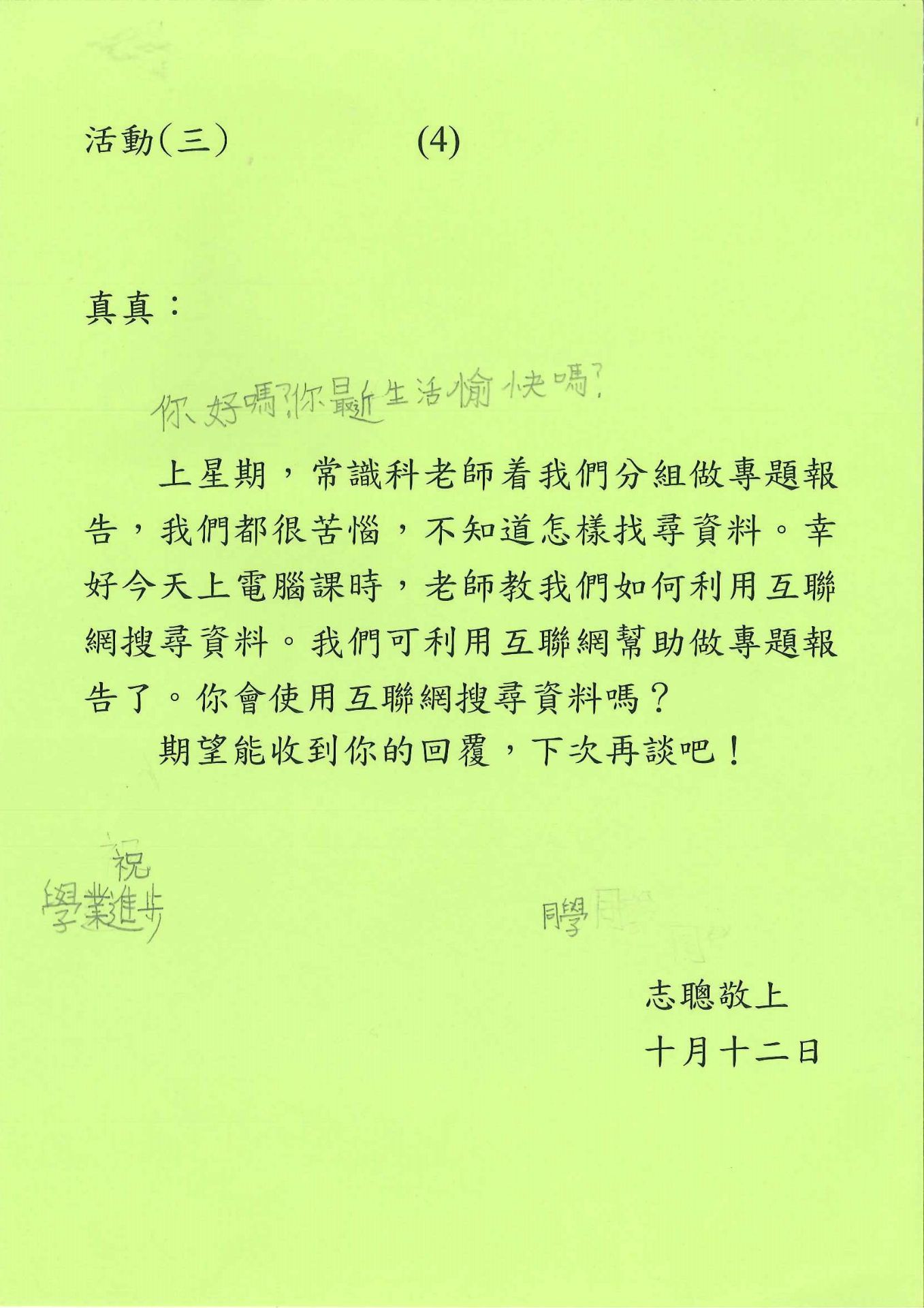 課上活動: - 能按正確格式排列信 - 能找出書信中缺漏的格式, 並補上合適的句子