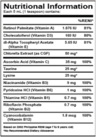 VITAMIN A FOR GOOD EYESIGHT VITAMIN D3 HELPS THE BODY ABSORB CALCIUM AND PHOSPHOROUS VITAMIN E FOR HEALTHY SKIN CHLORELLA FOR HEIGHT VITAMIN C FOR AN ENHANCED IMMUNE SYSTEM TAURINE FOR A SHARP MIND